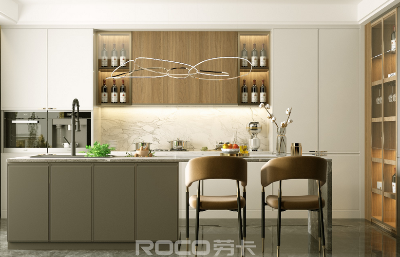 4、組合式酒柜,目前還有一種主流的設計是餐柜加上酒柜的組合,這種多功能組合柜的形式,不僅該少的功能都沒(méi)少,還減少了空間的占用,使空間利用率最大化。